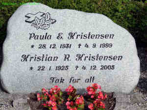 4. Gravsten, 2005, Skinnerup Kirkegård. Kåstrupvej 3, Tved Havreland, Tved Sogn, Hillerslev Herred, Thisted Amt De købte gården Kåstrupvej 3 i 1951, og slogte den i 1987. Kristian blev gift med Paula Elisabeth Gravgaard Larsen [868] [MRIN: 543], datter af Henrik Larsen [825] og Inger Kirstine Gravgaard [826], den 5 Okt. 1950 i Kåstrup Kirke 14.,15 (Paula Elisabeth Gravgaard Larsen [868] blev født den 28 Dec. 1931 i Øster Ræhr, Ræhr Sogn, Hillerslev Herred, Thisted Amt 21, dåb den 14 Feb. 1932 i Vigsø Kirke,21 døde den 4 Sep. 1999 i PL Haldsvej 24, Thisted, Viborg Amt 22 og blev begravet den 9 Sep. 1999 i Skinnerup Kirkegård 22.). Årsagen til hendes død var Canser. |