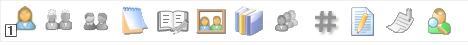 | De 12 ikoner nævnte fra venstre: Ægtefæller, Forældre, Søskende, Notater, Fortælling, Mediegalleri, Kilder, Også kendt som, Hastags, Begivenheder, Opgaver, Forskningshjælp