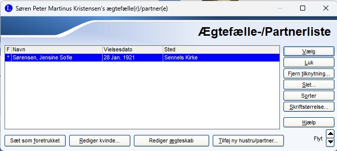 | Har kan man bl.a. tilføje en ny ægtefælle / partner. Med de to pile til højre sættet ægtefæller i rigtig rækkefølge. Marker hvem der er foretrukket ægtefælle, eller slette en ægtefælle der er forkert. |