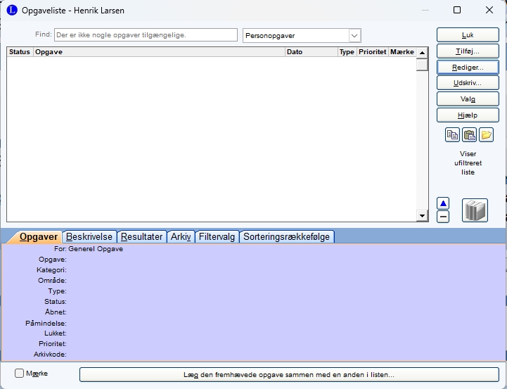 | Bruger jeg ikke. Klik på ikonet, og derefter på knappen Hjælp, for at læse om anvendelse. Opgaver man opretter her kan man få vist på fanen Startside i Legacy. |