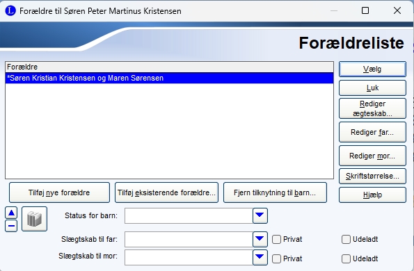 | Man kan tilføje et nyt hold forældre. Tilføje et hold eksisternede forældre. Fjerne tilknytning til et barn. Hvis barnet er tvilling, kan det vælges i feltet Status for barn: I de to felter Slægtskab til far og mor kan man væle tilhørsforhold, så som biologisk, adopteret, pleje m.m., klik på pil for at vælge. Hvis man ikke marker i Privat eller Udeladt, vises begge hold forældre i rapporter og på hjemmesiden. Marker privat, kommer der kun til at stå Privat ved det hold forældre man har sat den markering ved, og sætter man markering ved Udelant, vises det hold forældre slet ikke. Bemærk at det hold forældre der er markeret med blå (valgt) når man klikker på knappen Vælg, er dem der vises so stndard i Legacy. |