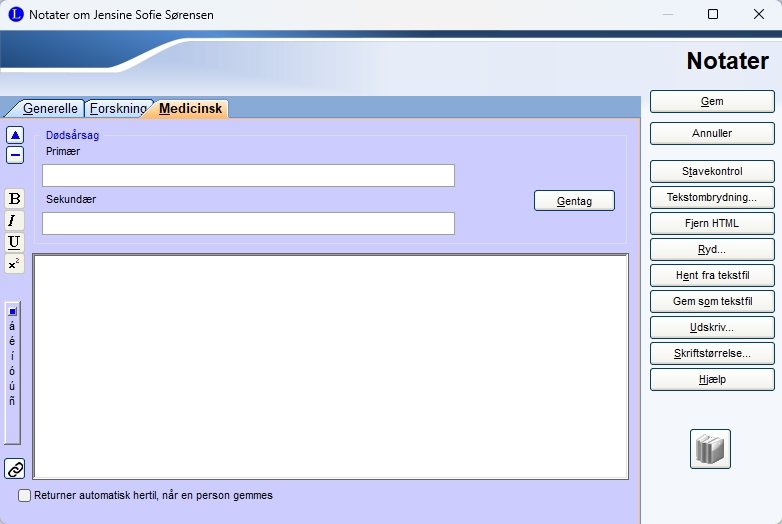 | Fanen Medicinsk, skriver man dødsårsag her kommer det til at stå på forsiden ved personen i feltet Død af |