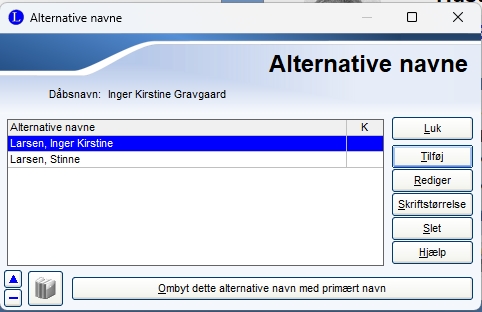 | Bruges til at skrive alternative navne, det kan f.eks. være en anden stavemåde end ved dåb, eller hvis personen har ændret navn. Bruger den også til at skrive gift navn, hvis persone har ændret navn ved vielse. |
