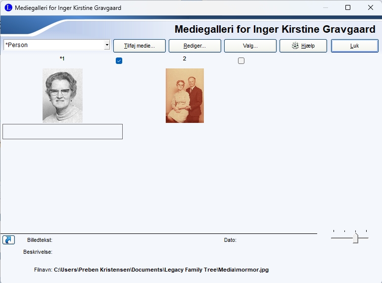 | Se oversigt over billeder tilknyttet til personen. Tilføje et nyt billede / medie. Under Valg kan man fjer et billede fra galleriet, samt vælge Sæt som foretrukket for det billede man har valgt, hvorved det er det billede der vises i Legacy. |