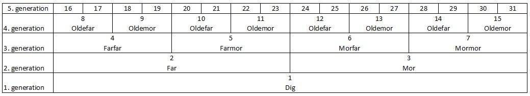 Det fortegår ved at den person man står på bliver nummer 1. Faderen Nummer 2, og moderen nummer 3. For hver generation dobles nummeret så op. Se skemaet her over. |
