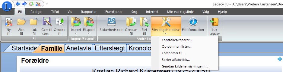 Kontroller/ reparer: Undersøger din datafil for fejl, og retter dem. Hvis der er fejl Legacy ikke selv kan rette. Vises en liste med de resterende fejl, som man så kan rette manuel.