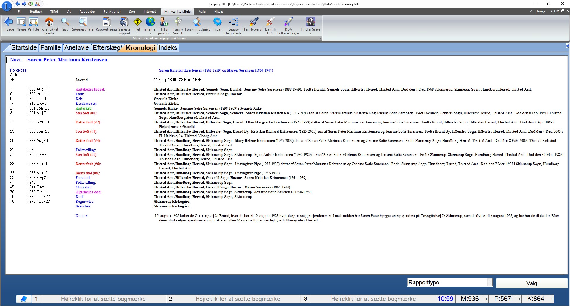 Viser kronologisk data for den person man står på.