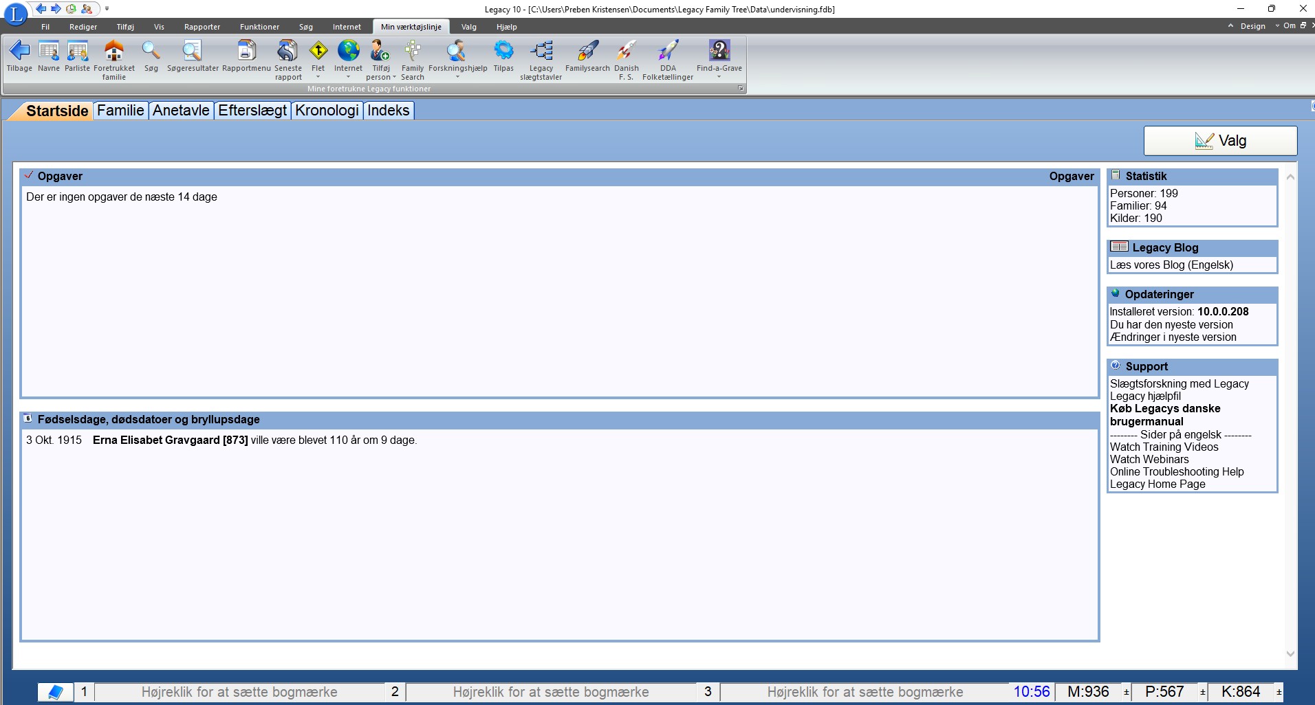 Man kan også se Opgaver, samt påmindelser for fødselsdage, dødsdatoer og bryllupsdage, hvis man bruger dette. Legacy anbefaler at man starter på denne fane, så man er sikker på at se hvis der er opdateringer til programmet. |