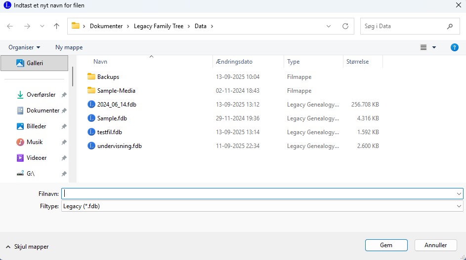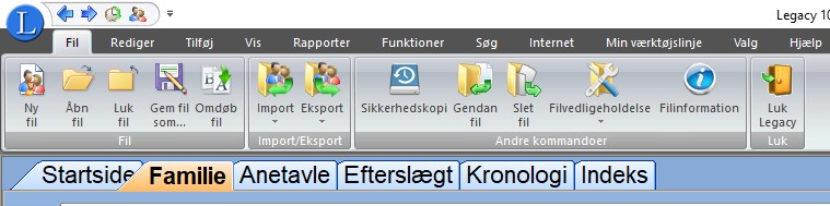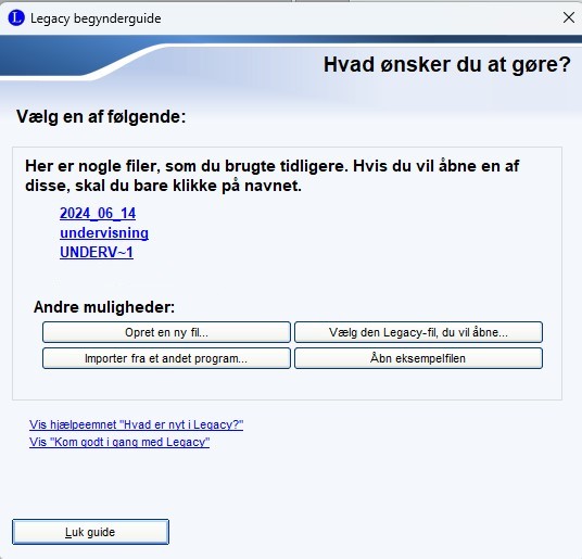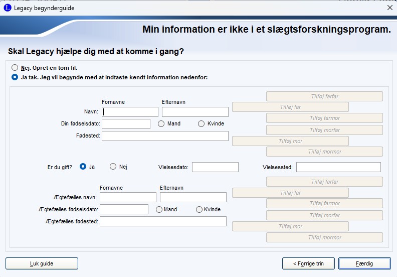 | Hvis du har valgt Ja tak. Jeg vil begynde med at indtaste kendte informatione nedenfor: Vil Legacy åbner databasen med de oplysninger du har tastet ind. |