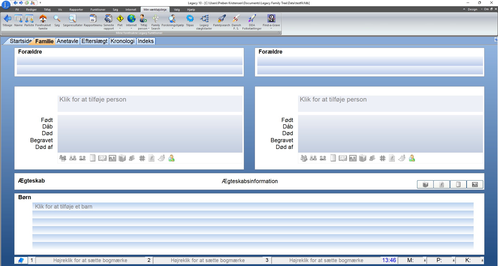 Klik hvor der står Klik for at tilføje en person for at indtaste den første person i databasen. Ruden til venstre er til mænd og den til højre til kvinder.