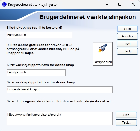 I øverste felt skrives navnet man ønsker at få vist under ikonet, når den indsættes i menuen. I det andet flet skrives det man ønsker vist hvis man kører musen hen over feltet I tredje felt kan man lave en beskrivelse af funktionen af ikonet Disse to kan man lade stå tom I det nederste felt skrives f.eks. adressen på en hjemmeside, som så åbnes hvis man klikker på ikonet. Klik på Gem, og træk derefter ikonet op i menulinjen hvor du vil have den. |