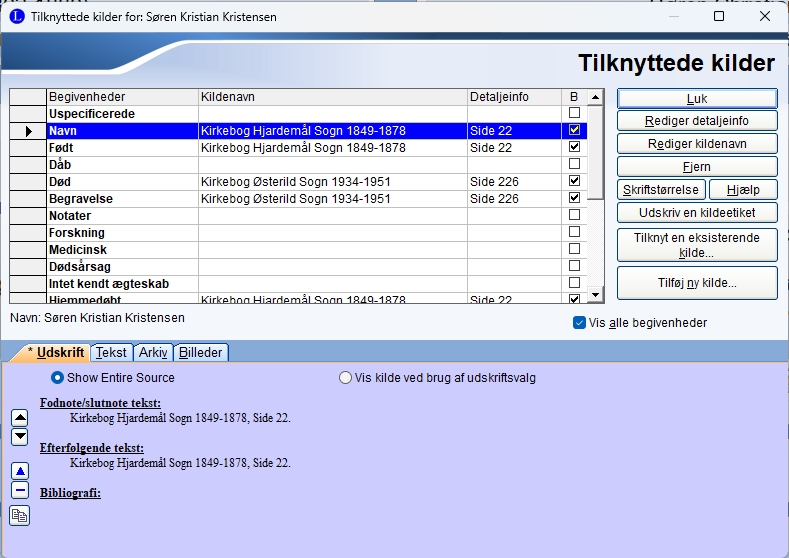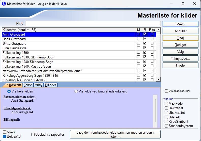 Marker det felt du vil indsætte klide for, f.eks. fødsel, og klik på knappen Tilknyt en eksisterende kilde. Hvorefter du får en oversigt over de kilder du allerede har. |