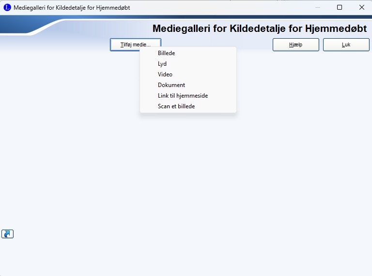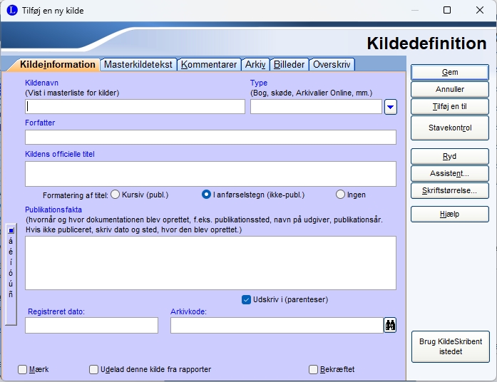 Har du ikke kilden i forvejen, klikker du på knappen Tilføj, og nedenstående vindue åbnes. Her beskrive et eksempel på oprettele af en kilde til en kirkebog på den måde jeg gør det, men det er selvfølgelig op til den enkelte hvordan man vil oprette en kilde.