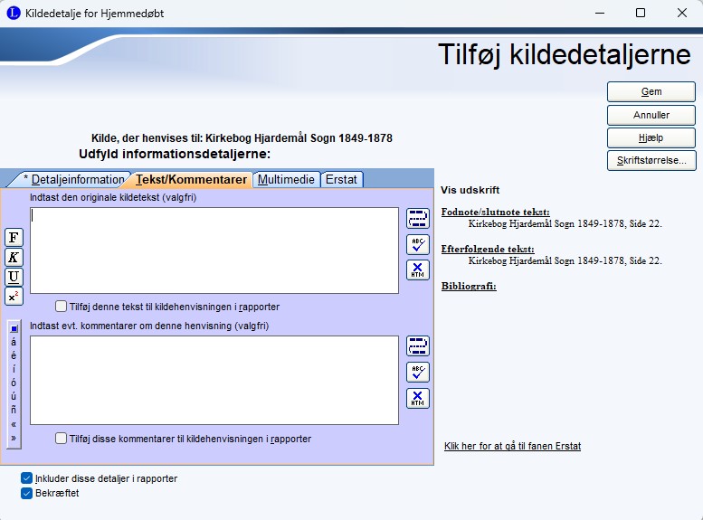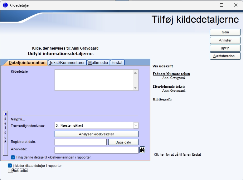 I feltet Kildedetalje skriver du f.eks. Side 27 eller Opslag 30 alt efter hvordan du ønsker at bruge systemet. Anbefaler at man bruger Side / Folio frem for Opslag.