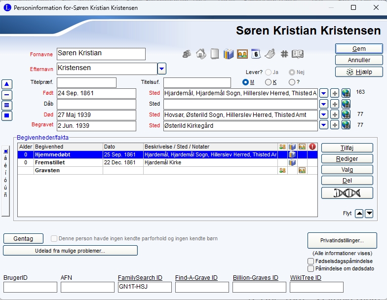 Er det en ny person du har oprettet og ved at indtaste kilde for vil du typisk have udfyldt felterne med Fornavn, Efternavn, Fødsel, Dåb, eller Hjemmedøbt og Fremstilling.