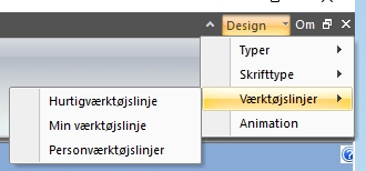 Igen klik på Design i øverste højre hjørne. Vælg Værktøjslinjer, og vælg her efter Min værktøjslinje. |