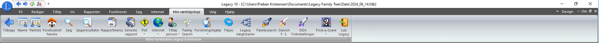 Jeg har valgt fire funktioner i Hurtigmenuen. Tilbage, Frem, Historieliste og Slægtskabsgeregner. Nu konfigurer vi så Min værktøjslinje. |