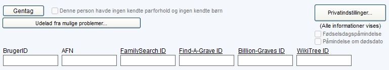 De 3 felter BrugerID, AFN og WikiTree ID bruger jeg ikke.