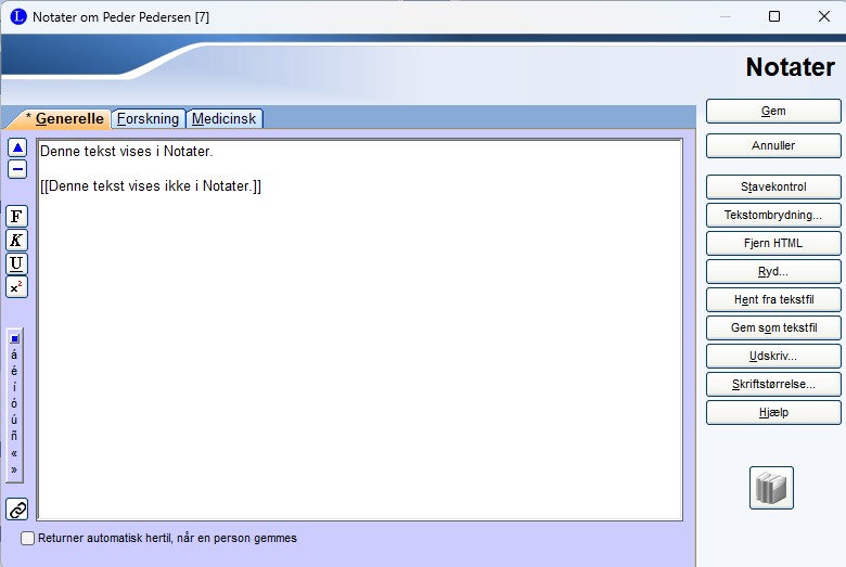 Hvis der er nogen af notaterne man ønsker skjult i rapporter og på hjemmesider, gøres det på følgende måde. Ved starten af den tekst man ønsker skjult sætter man to [[ og ved slutningen sætter man to ]] Se eksempel her over. |