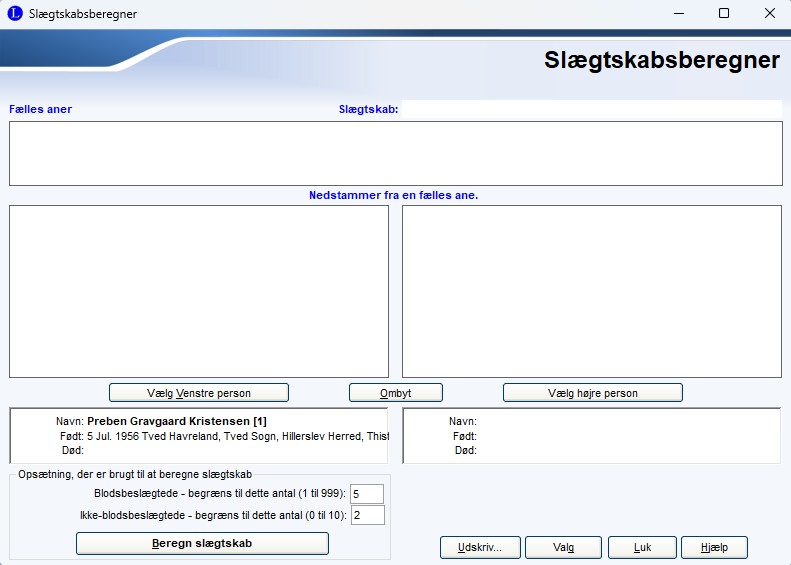 Nu åbnes dette vindue. Klik på knappen Vælg højre person eller Vælg venstre person for at vælge den som der skal beregnes slægt i forhold til. Klik på knappen Beregn slægtskab. |