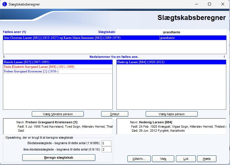 Der er nu beregnet slægtsskab mellem de to personer. Fælles forfædre vises i øverste rude. Hvis der er flere forbindelser vises de som flere linjer. Kik på knappen Udskriv for at få vist Slægtskabsskema. |