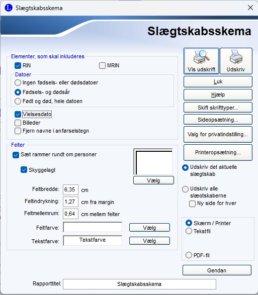 Her kan du vælge hvilke ting der skal med på skemaet. Klik på knappen Vis udskrift for at få vist Slægtskabsskemaet |