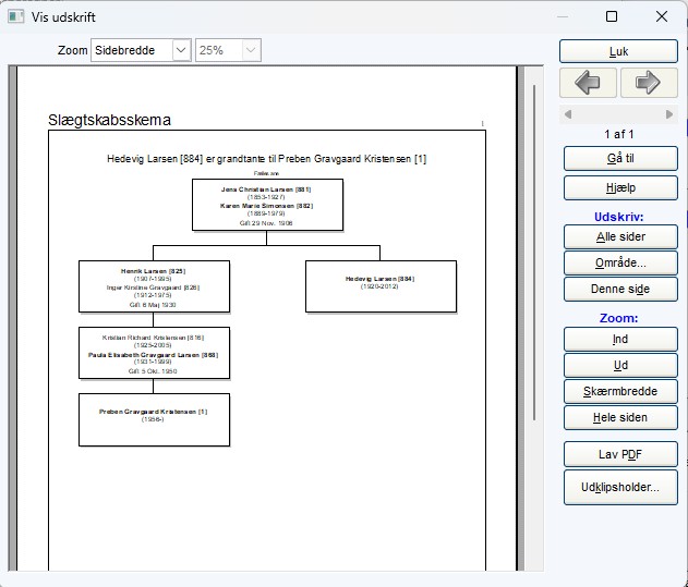 Du kan nu klikke på knappen Lav PDF for at få lavet Slægtskabsskemaet som en PDF fil, eller du kan klikke på knappen Luk for at gå en side tilbage, og så der vælge Udskriv for at printe siden ud. |