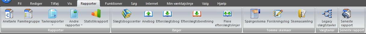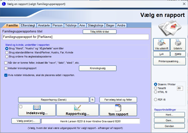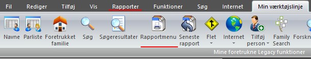 For det meste bruger jeg de to rapport typer Anebog og Efterslægtsbog. Læs lidt om Anebog her: Anebog Læs lidt om Efterslægtsbog her: Efterslægtsbog Vil ikke komme nærmere ind på de enkelte muligheder for at lave rapporter. Man kan prøve sig frem med hvilken type rapport der passer en bedst.