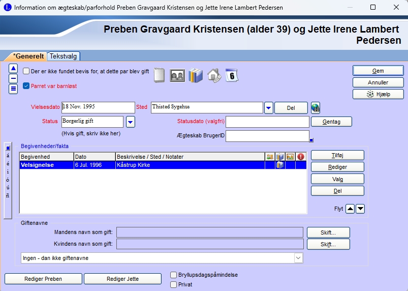 Her kan man indtaste vielsesdato og sted. Hvis det er en kirkelig vielsen vælger man ikke noget i feltet Status. Hvis de havde et forhold uden at blive gift markered det i feltet Der er ikke fundet bevis for, at dette par blev gift. Ligeså kan man marker hvis paret var barnløs. I feltet Begivenheder/fakta kan man tilføje f.eks. velsignelse, skilsmisse og andre ting relevant for et par. |