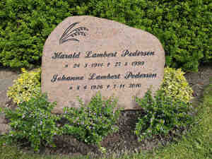 3. Gravsten, 2010, Fjerritselv Kirkegård. Johanne married Harald Lambert Pedersen, son of Christian Lambert Pedersen and Johanne Marie Sørensen, on 27 Dec 1946 in Gøttrup Kirke.1223 (Harald Lambert Pedersen was born on 24 Mar 1914 in Koldborg Mark, Gøttrup Sogn, Vester Han Herred, Thisted Amt 1224, christened on 1 Jun 1914 in Gøttrup Kirke,1224 died on 27 Aug 1999 in Brovst Amtssygehus, Brovst Sogn, Øster Han Herred, Hjørring Amt 1225 and was buried on 3 Sep 1999 in Fjerritslev Kirkegård 1225.) |