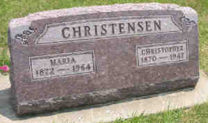 1. Gravsten, 1947. Maria married Christopher “Big Chris” Christensen, son of Christen Christensen and Ane Jensine Christoffersen, on 4 Apr 1908 in Marcus, Cherokee County, Iowa, United States. (Christopher “Big Chris” Christensen was born on 13 May 1870 in Skjoldborg Sogn, Hundborg Herred, Thisted Amt, christened on 9 Oct 1870 in Skjoldborg Sogn, Hundborg Herred, Thisted Amt, died on 22 Feb 1947 in Buena Vista County, Iowa, United States and was buried in Feb 1947 in Scandinavian Cemetery, Alta, Buena Vista County, Iowa, United States 22440.) |