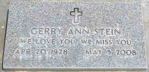 1. Gravsten. Geraldine married Paul George Stein, son of George Joseph Stein and Anna Magdalena Arneberg, on 20 Jul 1944 in Yuma, Yuma County, Arizona, United States. (Paul George Stein was born on 7 Oct 1926 in Los Angeles, Los Angeles County, California, United States,2065 died on 17 Mar 2003 in Chico, Butte County, California, United States 2065 and was buried on 21 Mar 2003 in Orland IOOF Cemetery, Orland, Glenn County, California, United States 2065.) |