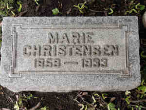 1. Gravsten. Marie married Jens Christensen, son of Johan Christian Christensen and Mariane Jensdatter, on 30 Apr 1880 in Skyum Kirke.28947 (Jens Christensen was born on 30 Apr 1856 in Thisted Sogn, Hundborg Herred, Thisted Amt 28947,28948,28949, christened on 25 May 1856 in Thisted Kirke,28948 died on 3 Sep 1928 in Chicago, Cook County, Illinois, United States and was buried on 5 Sep 1928 in Acacia Park Cemetery and Mausoleum, Chicago, Cook County, Illinois, United States.) |