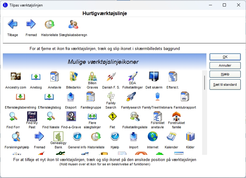 Jeg har valgt fire funktioner i Hurtigmenuen. Tilbage, Frem, Historieliste og Slægtskabsgeregner. Nu konfigurer vi så Min værktøjslinje. |